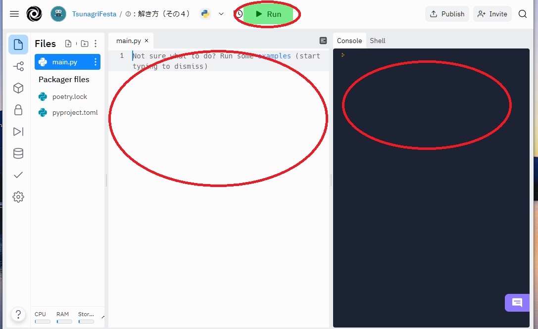 | ④プログラム作成 真ん中の「白い部分」にPythonプログラムを記述する 中央の「緑」のRunをクリック、プログラムが実行されます 右の「黒い部分」に実行結果が表示されます ![]() |