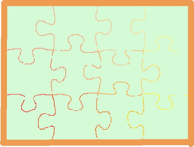 パズルのピースを組み込みます 準備されているピース12片と「本体」、「台紙」を「コスチューム」として組み込みます A1~A12を名前を変えず組み込めば完成です |