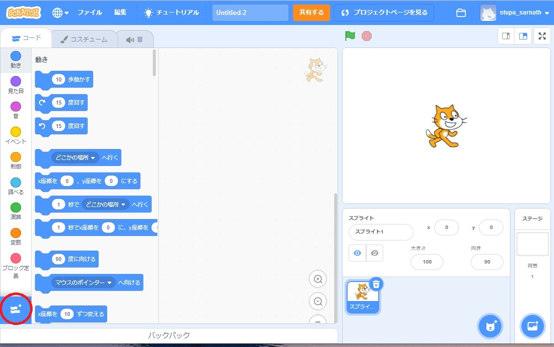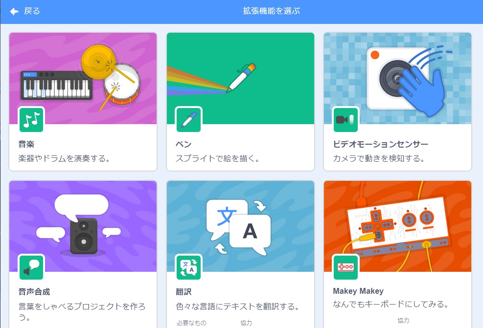 「コミュニティーサイト」に入ります![]() 「コミュニティーサイト」の画面 「作る」をクリックし、編集画面に入る ![]() 「編集」の画面 左下の赤丸をクリックし、拡張機能の選択画面に入る ![]() 「拡張機能」の選択画面 左上の「音楽」をクリックし、音楽機能を追加する ![]() 「音楽」ブロックが追加された編集画面 拡張機能を使う上での留意点 拡張機能用のブロックは編集画面を閉じると消えます 次に編集する際に、もう一度拡張機能を追加してください |