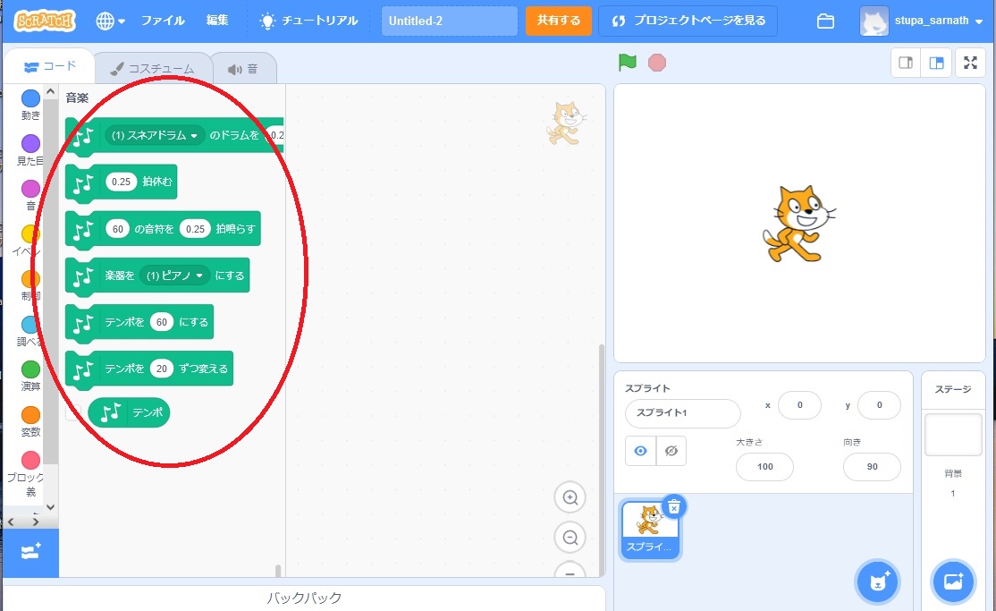 | 「C4」から始める 左端の白鍵「C」を「C4」に編集画面で赤丸印の名前を変更する 音階の表し方は「②キーボード」を参照 Ⅳ群を対象に音をあてていく 赤丸印の「コード」をクリックし、編集画面のコード部分を表示させる イベントブロックから「このスプライトが押されたとき」を編集エリアに持ってくる スプライトが押されたときに鳴る 音楽ブロックから「楽器を~にする」を編集エリアに持ってくる 「ピアノ」を指定する(省略時解釈はピアノなので指定しなくてもピアノになる) 音楽ブロックから「~の音符を~拍鳴らす」を編集エリアに持ってくる 「60」と指定する(262Hzのドの音が割当てられる) 「0.25」と指定する(4分音符が割当てられる) ![]() こうして「C4」のスプライトが押されると「4分音符」の「ド」の音が鳴る 残りの鍵に音を順序良く割振り、13鍵を完成させる リズム楽器を鳴らす場合には 音楽ブロックから「~のドラムを~拍鳴らす」を編集エリアに持ってくる 音と同じ様に指定しリズムを刻む |
